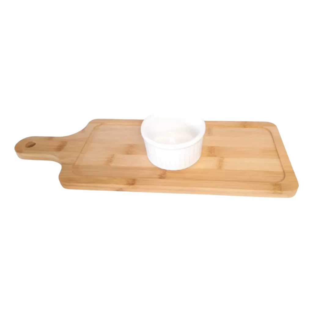 A Tabua de Servir (Petisqueira) em madeira Bambu retangular é uma peça que oferece destaque na sua mesa na hora de servir. Acompanha a petisqueira três ramequins para servir petiscos variados, ou seja, é perfeita para servir ou decorar sua mesa com bom gosto e beleza.